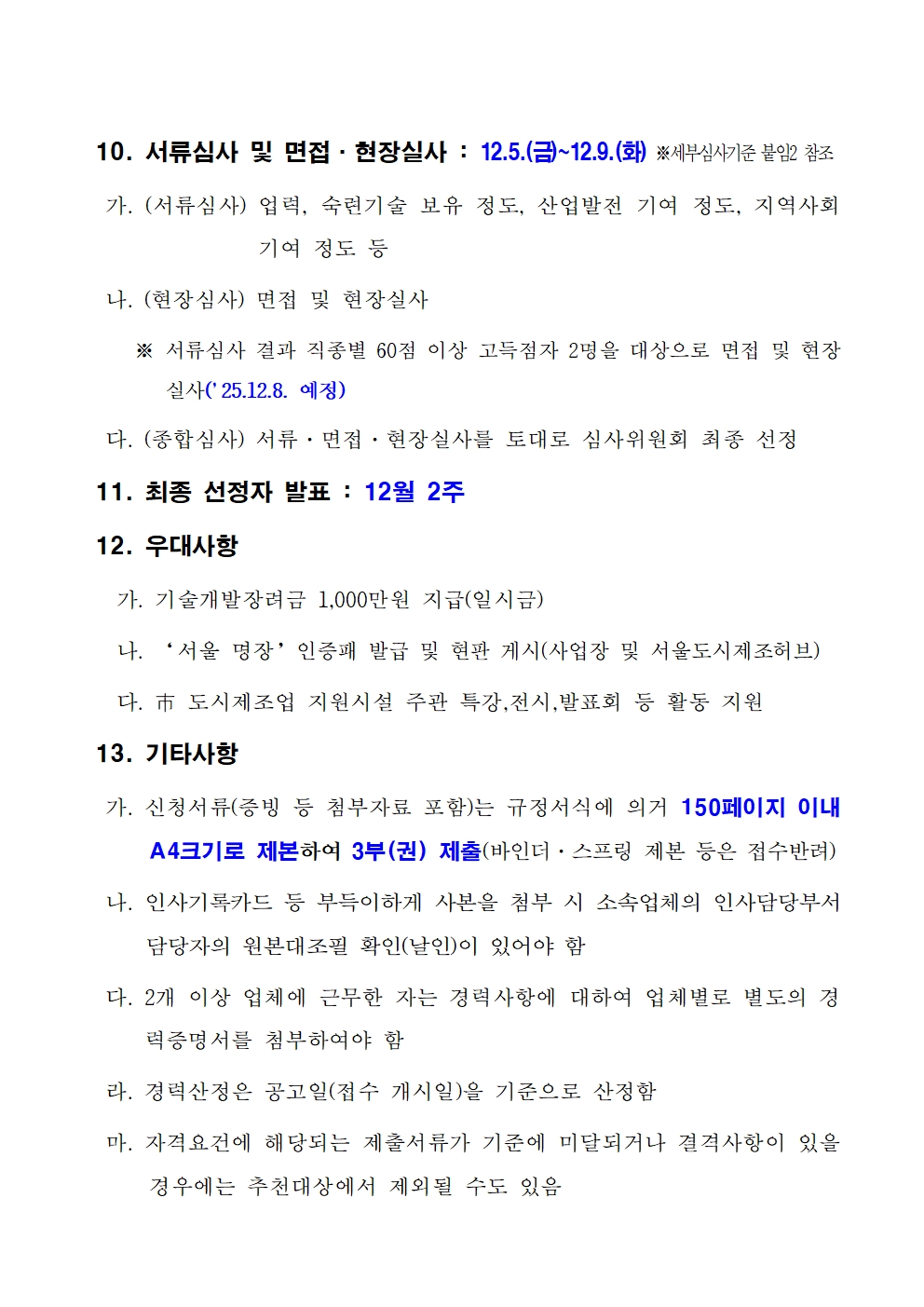 마. 우대사항 : 기술개발장려금 1천만원 지급, 서울 명장 인증패 및 현판 수여 등