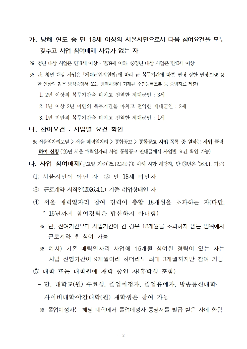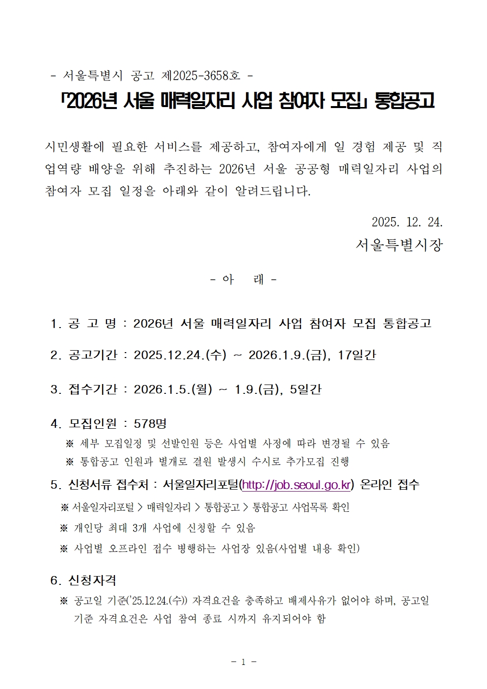 1. 공 고 명 : 2026년 서울 매력일자리 사업 참여자 모집 통합공고