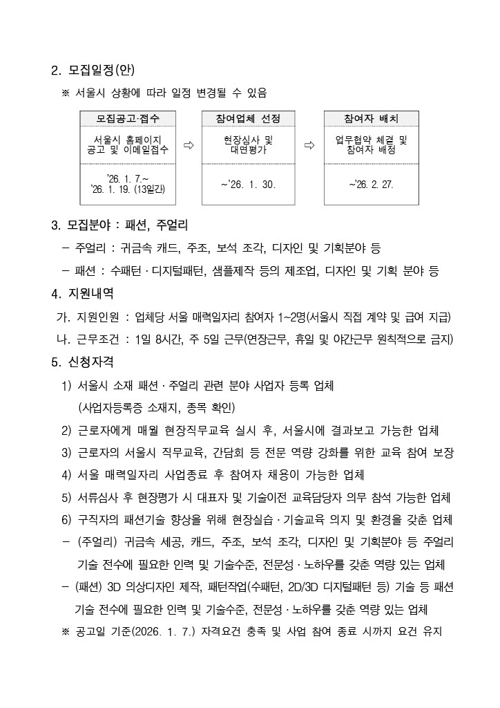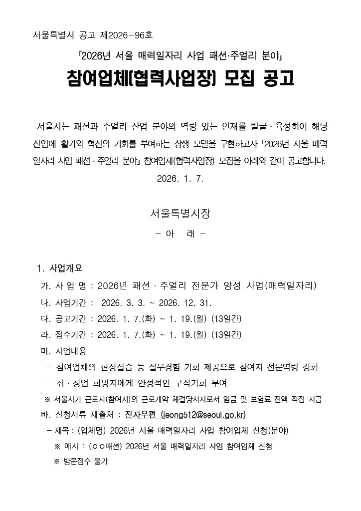 [정보공유] 「2026년 서울 매력일자리 사업 패션·주얼리 분야 참여업체 모집」 공고