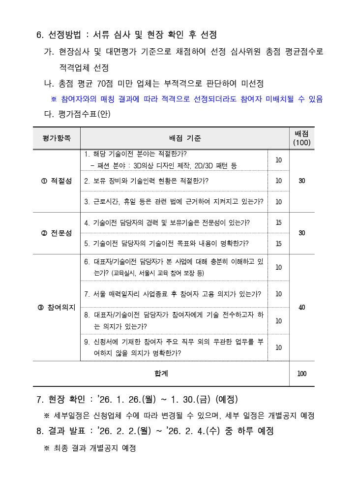 - 제목 : (업체명) 2026년 서울 매력일자리 사업 참여업체 신청(분야)