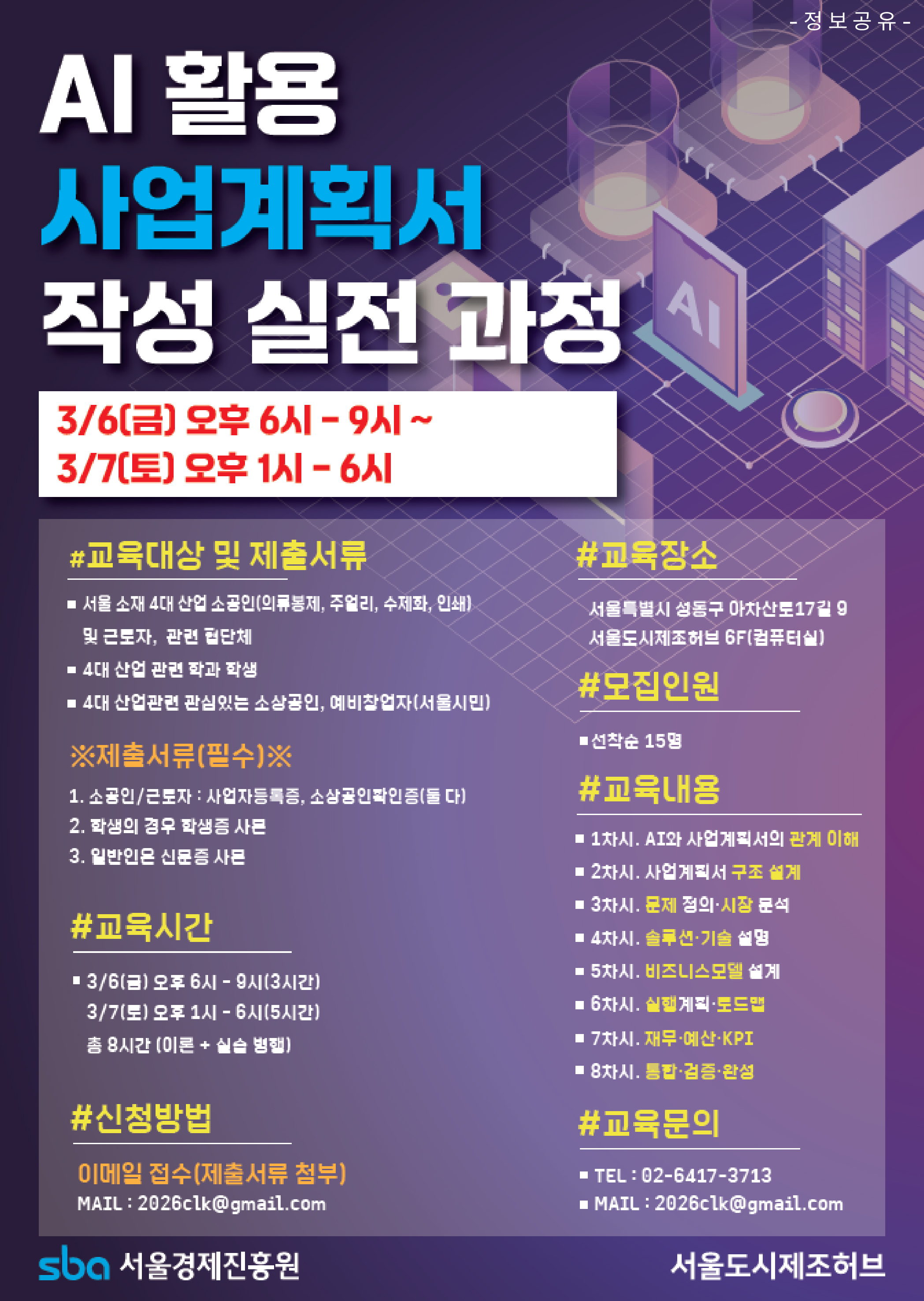 SBA 서울도시제조허브 기술창작실 주관의 「2026년 AI활용 사업계획서 작성 실전 과정」 모집 공고를 공유드립니다.
